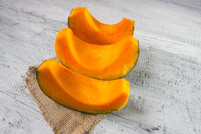 - Corte a abóbora longitudinalmente em quatro partes e depois corte cada uma das partes ao meio.